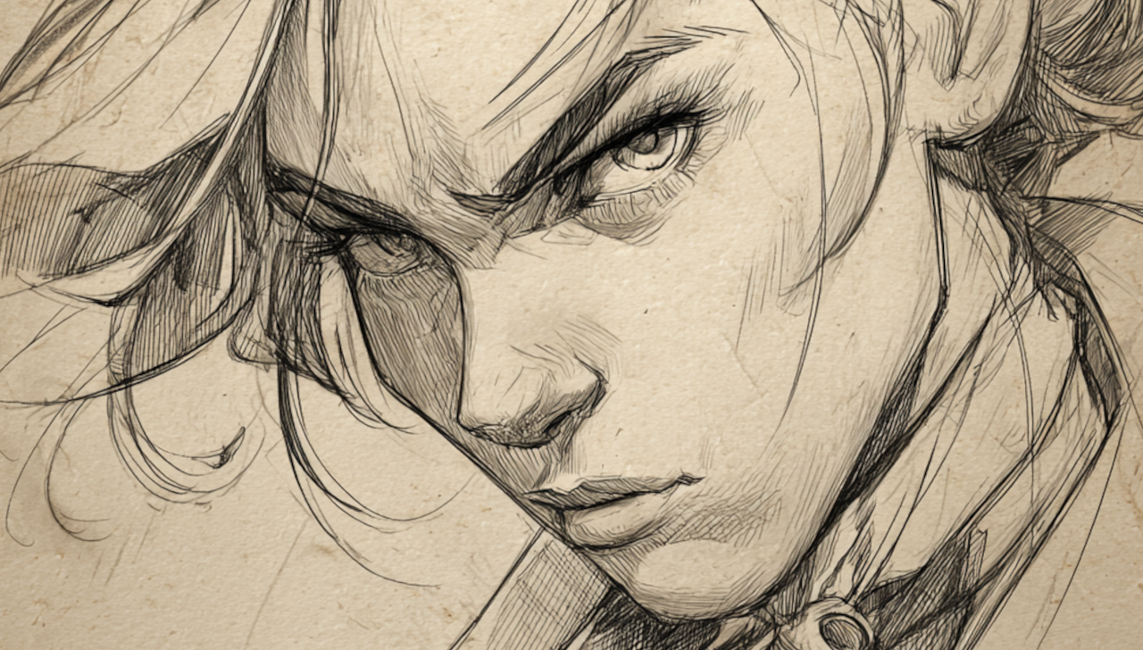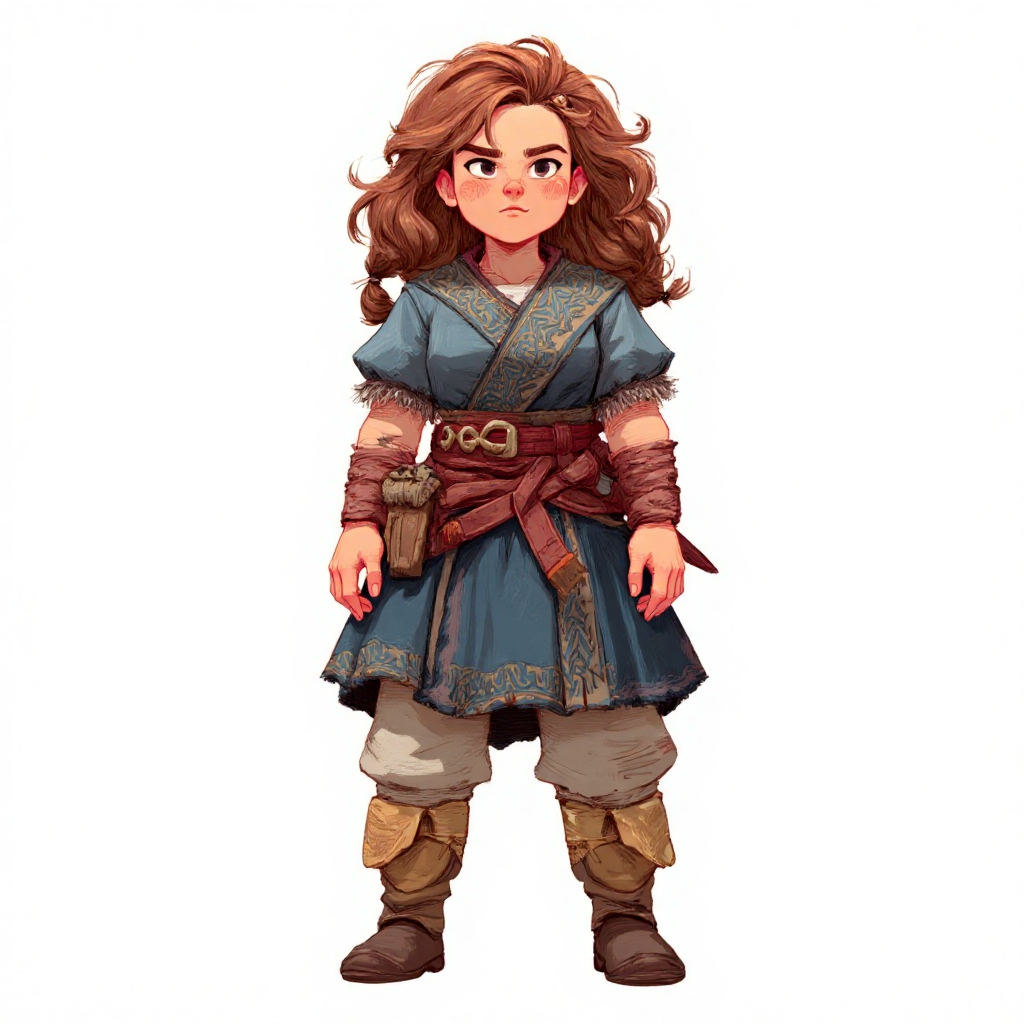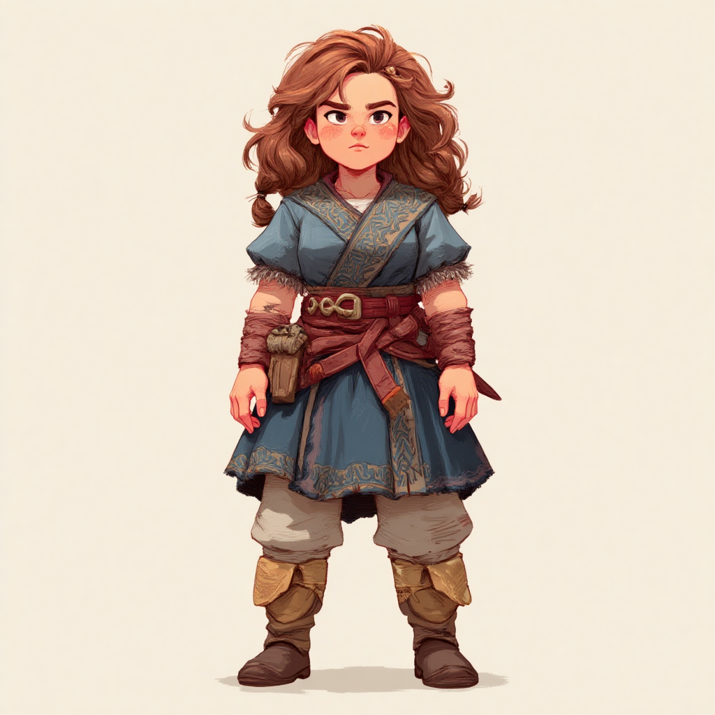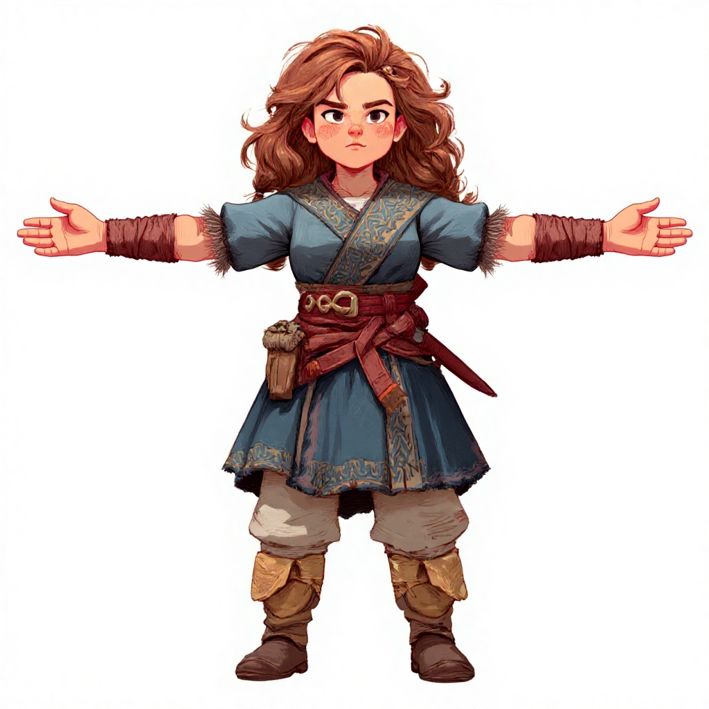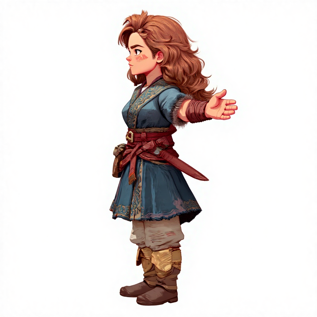 Imagine a side-angle shot of the character, clearly showing their profile as they stand/move.
