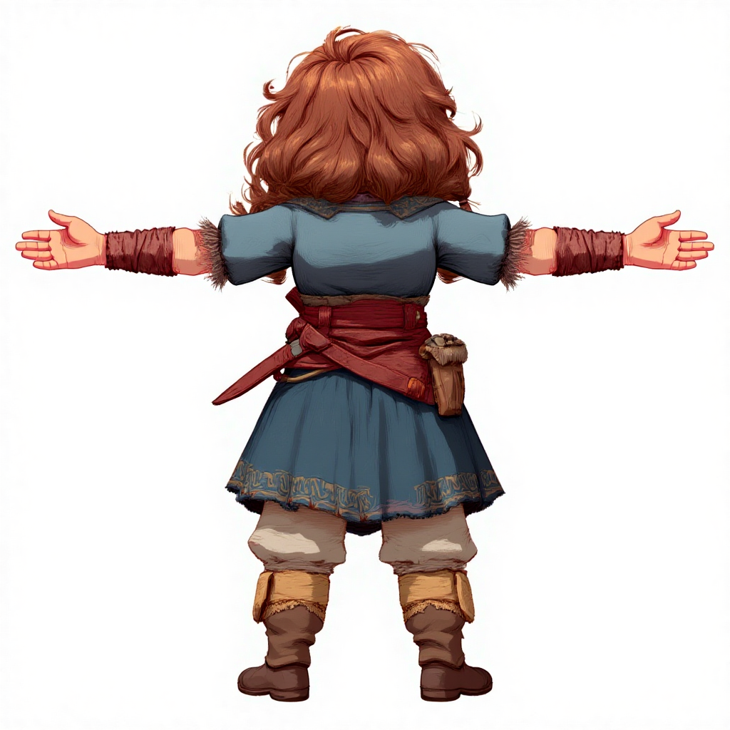 Show the character from behind, capturing their back and posture clearly.
