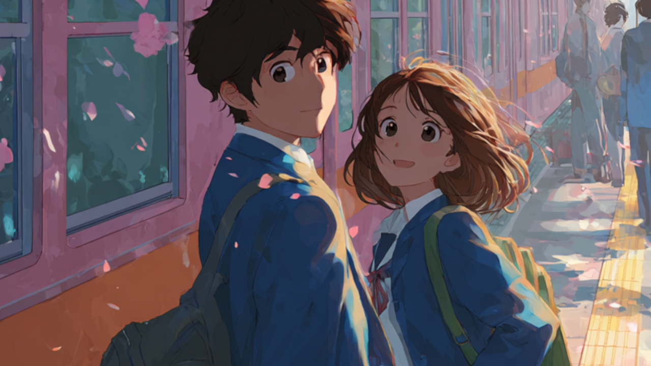 Le prompt est en trois étapes : Animate the character as follows: The camera remains fixed and does not move. he male character in the foreground turns toward the young girl and kisses her on the mouth. The movement should be realistic, with attention to weight, balance, and subtle details like joint articulation and shifts in posture.