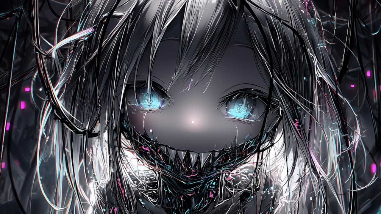 Le prompt est en trois étapes : Animate the character as follows: The camera remains fixed and does not move. TThe female character in the foreground bursts into a psychopathic, sadistic laugh. She tilts her head slightly to the side. The movement should be realistic, with attention to weight, balance, and subtle details like joint articulation and shifts in posture.