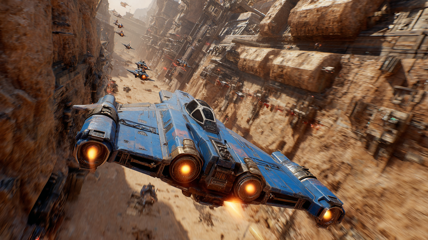 Le prompt est en trois étapes : Animate the character as follows: The camera remains fixed and does not move. The planes fly at extremely high speed through the canyon in a straight line. The movement should be realistic, with attention to weight, balance, and subtle details like joint articulation and shifts in posture.