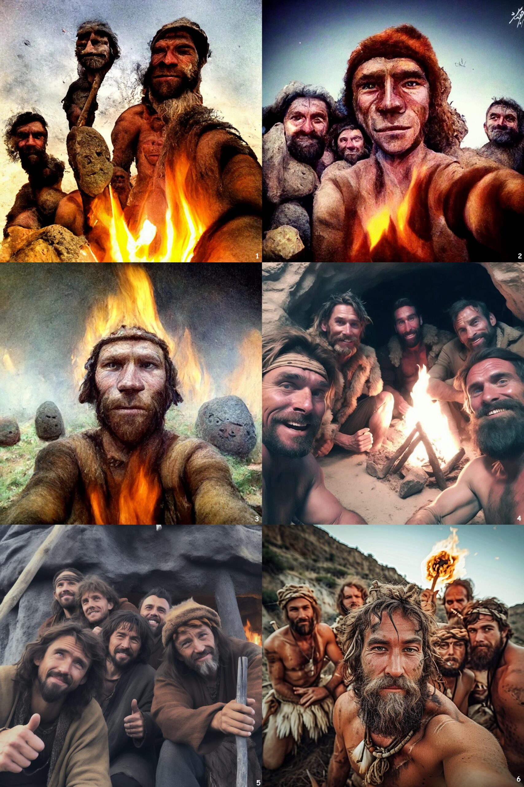 Dessine des hommes préhistoriques prennent un selfie car ils viennent de découvrir le feu !