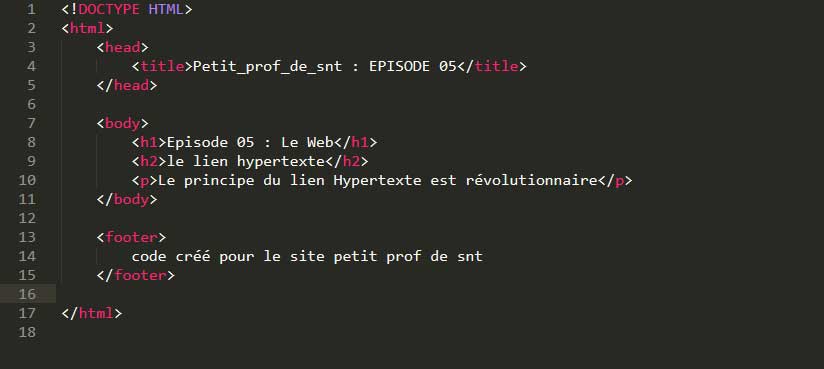 C'est pour cela que l'on parle de langage de balisage. On voit bien comment le site se structure en fonction de la taille des titres et de leur succession dans la page. La première balise d'un site internet est toujours : < !DOCTYPE HTML . Un site internet est toujours découpé en 3 parties : la tête (head), le corps (body), et les pieds (footer). On voit comment chaque partie commence et se termine par la même instruction : < head > pour commencer et < /head > pour terminer Chaque partie a ses spécificités : < Head > _ _ _ _ _ < /head > Cette partie concerne l'organisation de la page dans sa structure. C'est là que l'on va donner les instructions pour pouvoir dire quel style CSS va s'appliquer sur la page ou qu'on va donner le titre de la page tel qu'il va s'afficher dans le navigateur et non pas dans le contenu textuel de la page. Ainsi: < title > Petit_prof_de_snt : EPISODE 05 < /title > va s'afficher de cette manière DANS L'ONGLET du navigateur :